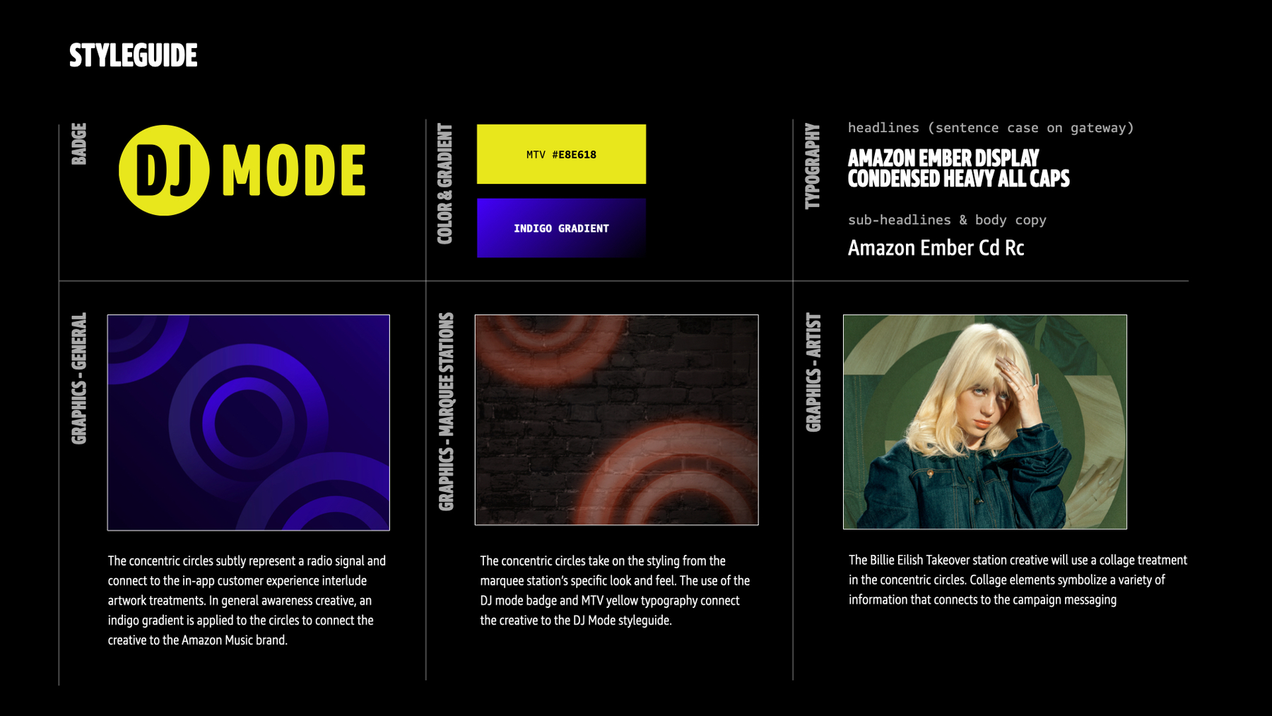 In 2021, Amazon Music launched a new product feature, called DJ Mode. This new feature delivers personalized, hosted stations with top DJs, featured artists, and music experts who share their stories, new music recommendations, and more. I worked closely with the product team to ensure alignment between the product and the marketing materials. We built a scalable design system for the global marketing campaign that spanned across web, mobile, print, and video.